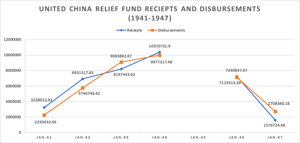 The United China Relief Fund was a cooperative association that provided aid to China and its people, beginning during the Second World War in 1941 and continuing until 1949. The above graph shows the receipts, or money donated, to the United China Relief Fund and disbursements, or money used by the fund. These disbursements were used for all types of aid to Chinese citizens, such as medical and public health projects, child welfare, education, reconstruction, disaster relief, and rehabilitation.