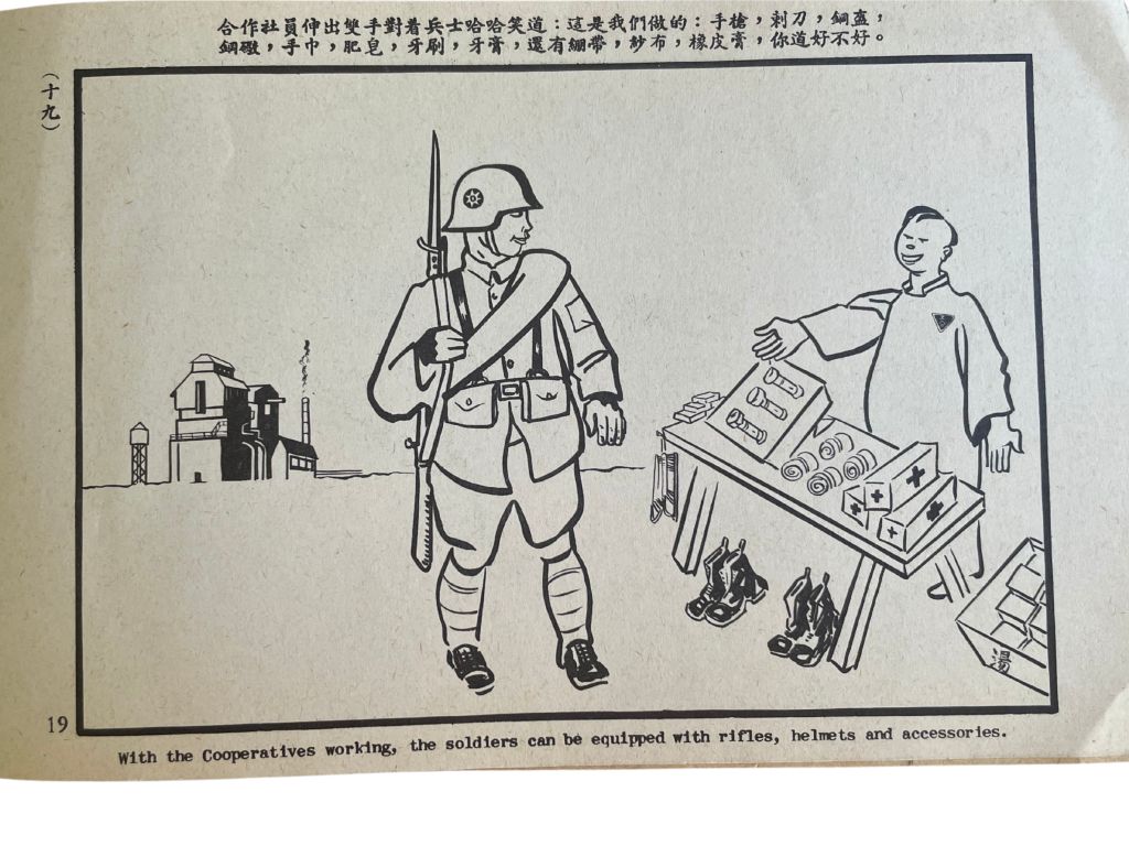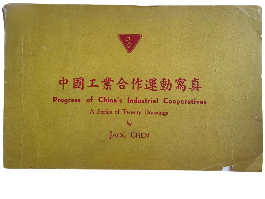 Among these visual materials, Jack Chen’s bilingual pamphlet stood out for its compelling depiction of the goals and accomplishments of the cooperative movement. The booklet, which included twenty original drawings illustrating the importance of industrial cooperatives during the war, was used not only for propaganda but also as a key fundraising tool, promoted widely through the Indusco Bulletin.